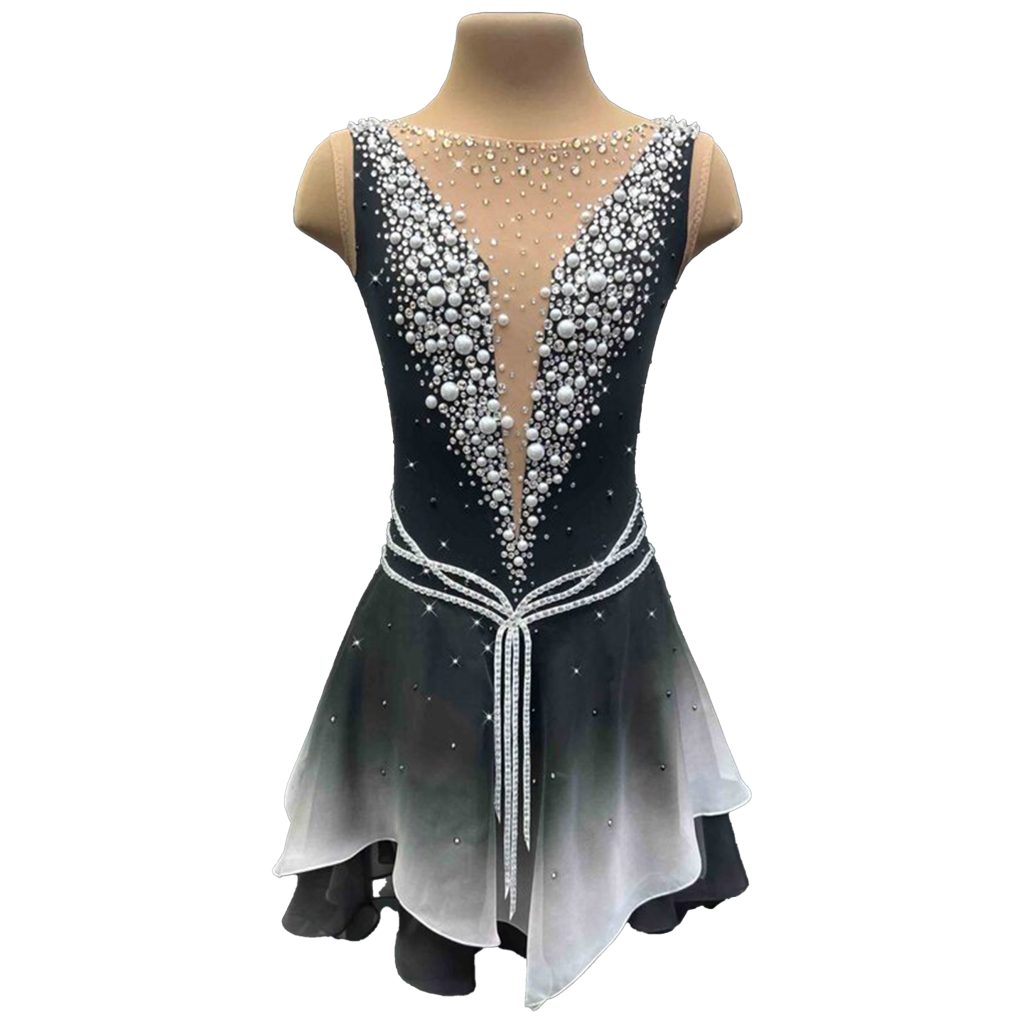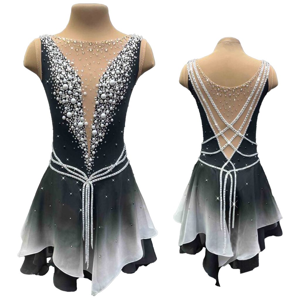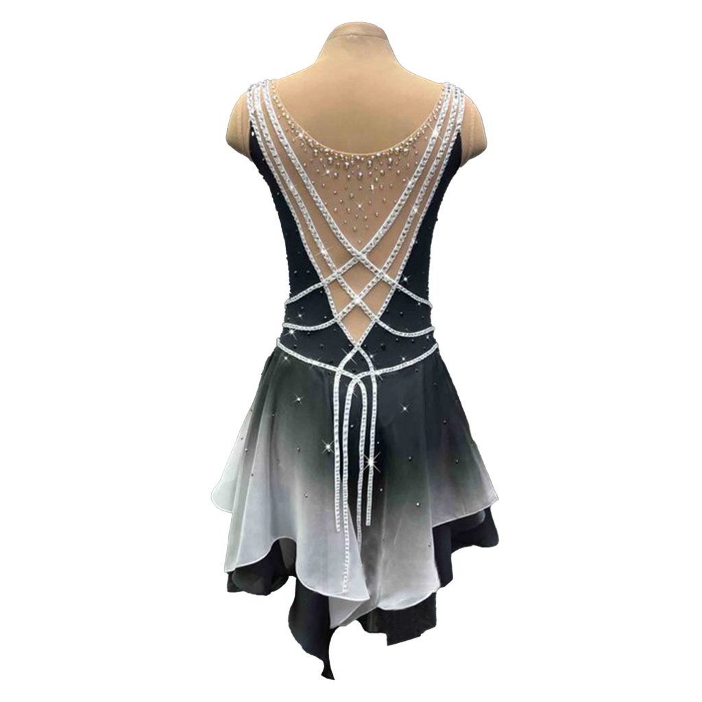 This skating dress features an elegant black and silver color scheme, with a skirt that smoothly transitions from rich black to delicate gray. The fabric is comfortable to the touch and has a great drape, allowing for easy movement. The upper body is made of thick fabric that hugs the curves of the body and highlights the figure. The V-neck and mesh stitching design add a sense of sophistication.