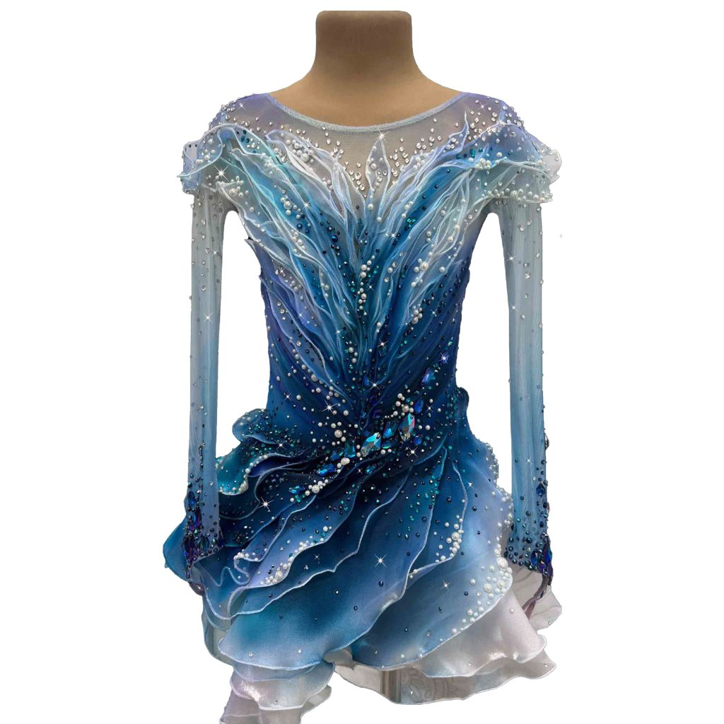 The beautifully designed bodice is decorated with a unique frozen wave pattern, embellished with hand-sewn pearls and sparkling crystals, and with every movement, They all sparkle with a rainbow of colors and shine brightly under the spotlight. The back of the skating dress is made of transparent mesh and decorated in a similar way, adding vitality and creativity. The long sleeves made of semi-transparent fabric complement the overall look. This skating dress fits the figure perfectly, providing free movement and ultimate comfort during performances.