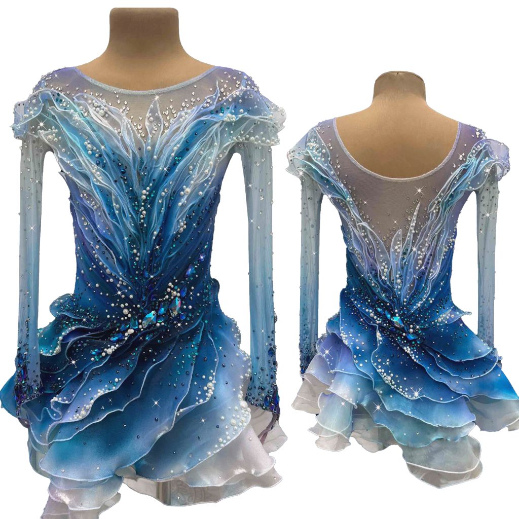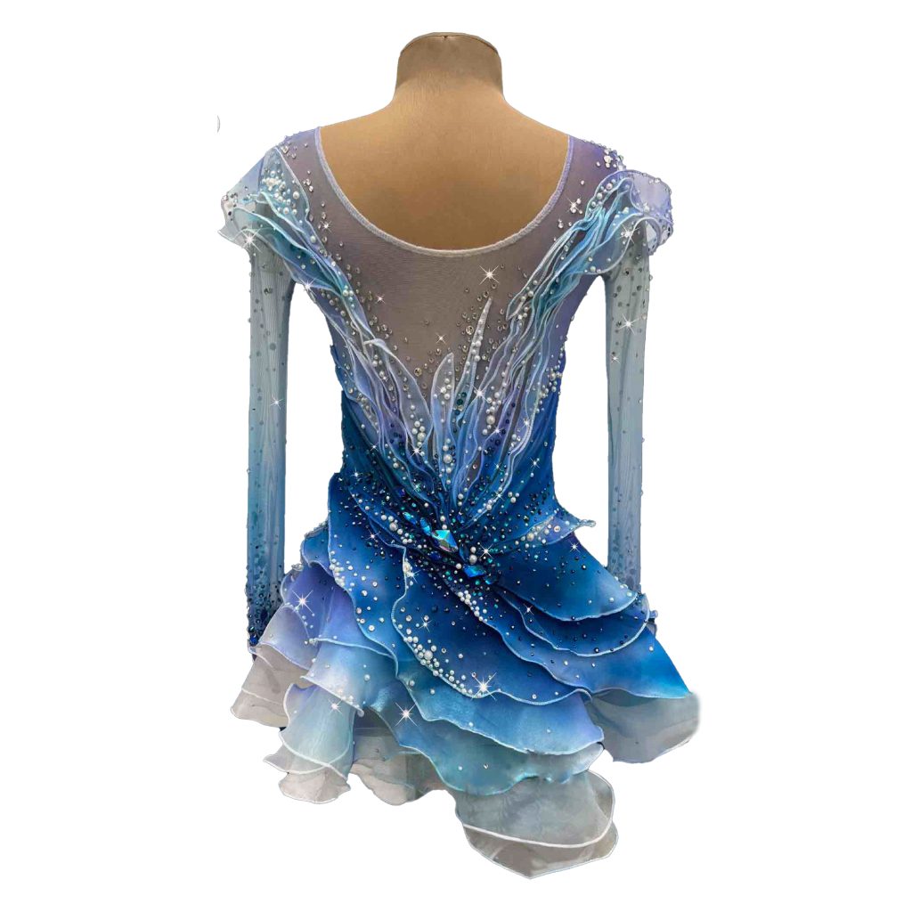 The dress is made from a light and flowing fabric that smoothly transitions from soft blue to rich blue, creating an enchanting seascape effect. The multi-layered skirt is made from delicate tulle and decorated with elegant ruffles, giving the dress a great sense of flow and volume, highlighting the skater’s graceful posture on the ice.