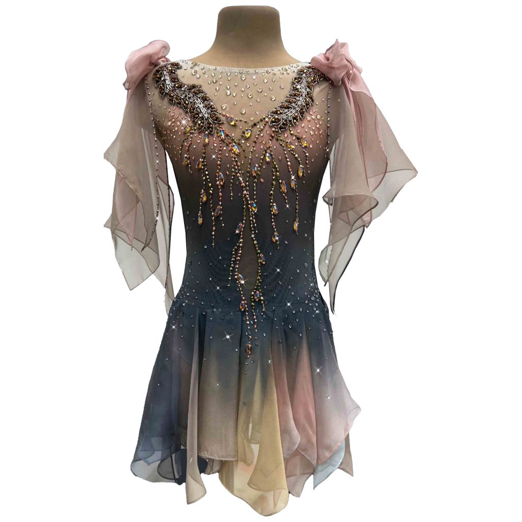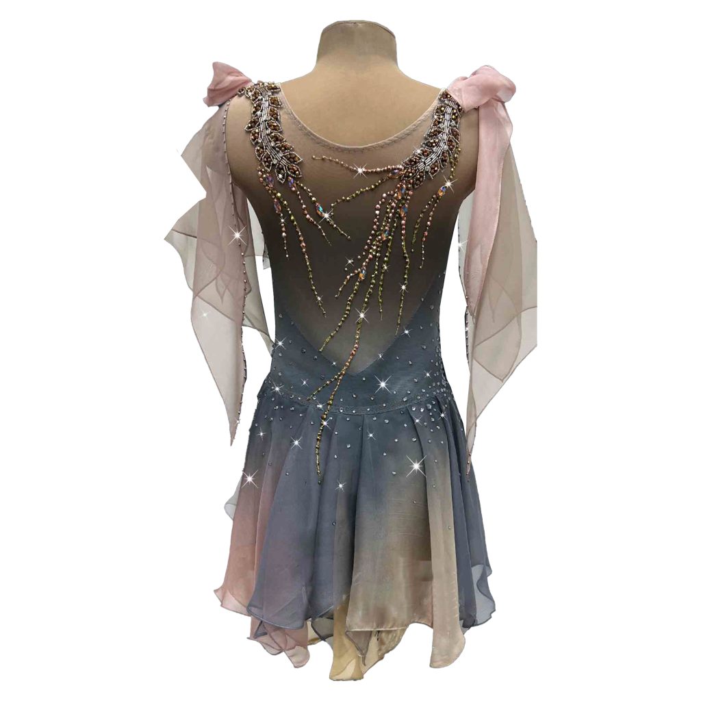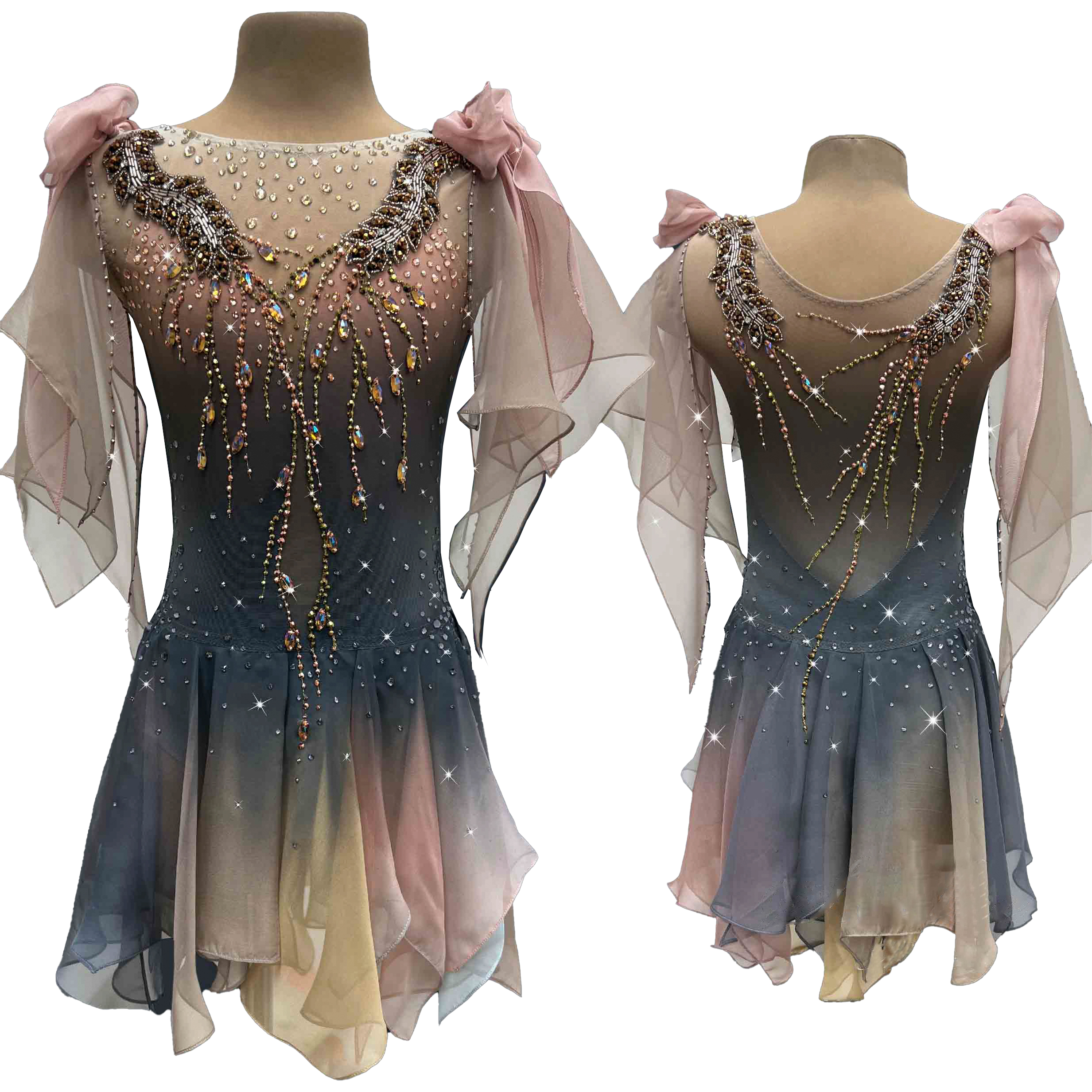 Suitable for skaters with a height of 122-128 cm. “The dress is unique in design, elegant and sophisticated. The main colors of the dress go from dark gray to soft pink-peach, creating an effect of smooth transition. This color scheme highlights the elegance of the figure and gives the dress a unique charm. The decoration of the dress is carefully polished. On the front and back of the bodice, elegant appliques of various gold and bronze crystals are embellished. They create a glittering feeling and give the dress an extraordinary elegance. The crystals are firmly sewn, keeping them safe even after many performances. The sleeves of the dress are designed in a light and flowing cape style, made of the same chiffon fabric as the body of the dress. They add a light and romantic touch to the picture and flutter gracefully during twirls and jumps. A delicate pink ribbon is tied on the shoulders, adding a chic sophistication to the dress. The hem of the skirt has a multi-layered asymmetrical design, adding more movement and elegance. Thanks to the high-quality cut and fabric, this dress does not restrict movement and allows you to perform various dance moves with ease. The dress fits the figure perfectly and highlights its advantages. This is a real work of art, which will help your athletes to show off their wonderful performances during competitions or exhibitions!