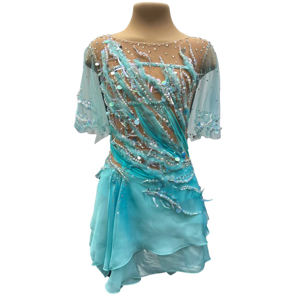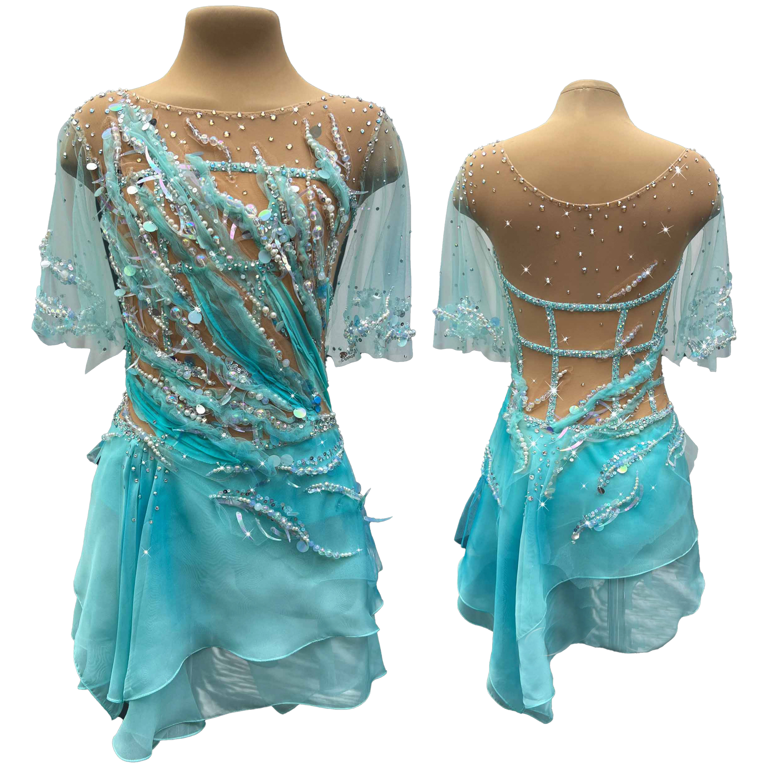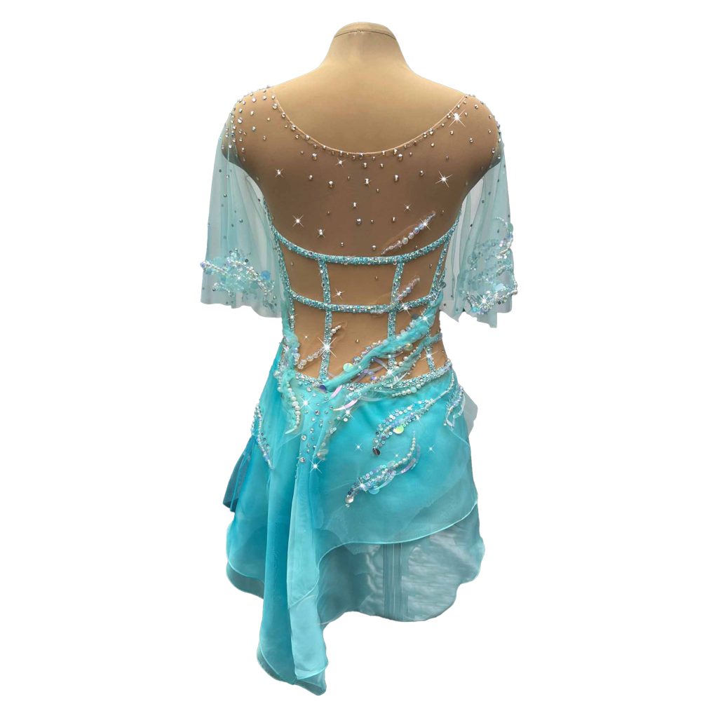 This skating dress is made of a light and flowing chiffon fabric that flows and sways during movement, creating a light and airy feeling. This fabric is comfortable to wear and does not restrict the body, providing a comfortable wearing experience during performances. The sleeves are semi-transparent and decorated with delicate lace. The center of the skirt is decorated with intricate appliques, creating the illusion of ocean waves. It is a combination of soft turquoise and transparent elements, and is embellished with many shining rhinestones and pearls. The decorative elements are firmly attached, ensuring its durability. The appliques cover the front and back of the skating dress, creating a harmonious and unified image. The back of the skating dress is decorated with mesh inlays with geometric patterns, which add dynamism to the design and make it more visually interesting. The skirt of this dress is cut asymmetrically, and the lower skirt creates a layered and fluffy feeling.